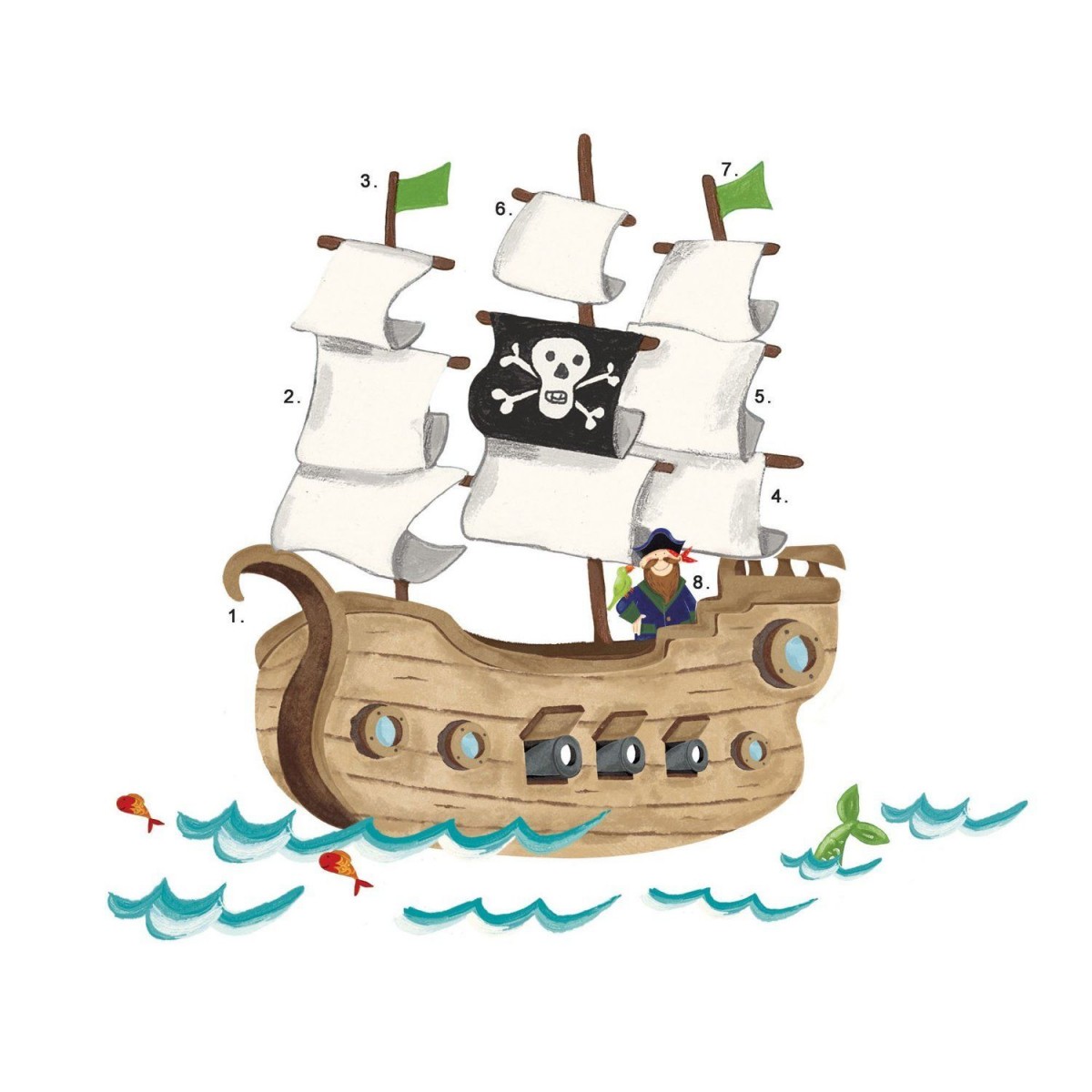 Наклейки, входящие в набор, содержат изображение плывущего по волнам пиратского корабля, с капитаном корабля, стоящим на борту, и его попугаем.