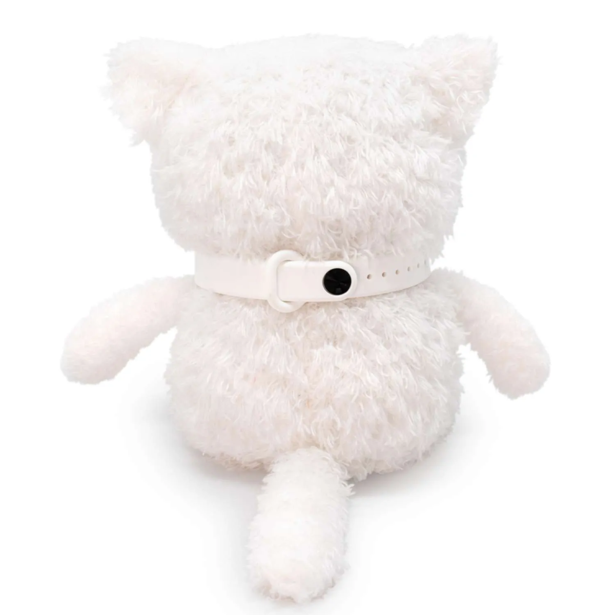 На шейке у котёнка силиконовый чокер с названием и небольшим подвесом в виде белой чашечки. Чокер легко снимается и может послужить в качестве модного браслета для ребенка.