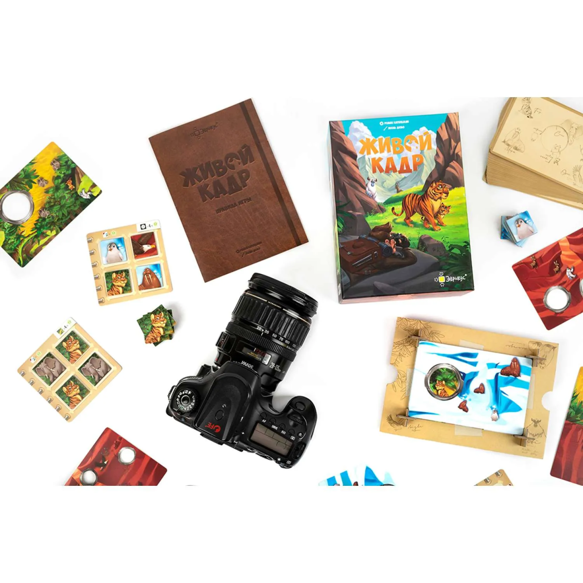 Представьте, вы фотограф дикой природы, и делаете прекрасные снимки животных. Однажды, выбирая место для съёмки вы увидели нечто необычное. Неужели йети?! Ошеломлённый, вы пытаетесь достать фотоаппарат, но существо стремительно исчезает в зарослях. Отныне вы и ваши друзья полны решимости заполучить его фотографию. Эта экспедиция будет очень интересной! "Живой кадр" – это забавная семейная игра с необычной механикой, имитирующей настоящую фотосъемку с удивительными компонентами. Вам предстоит фотографировать диких животных, собирать тематические альбомы и надеяться поймать в кадре фигуру йети. Небольшая коробочка превращается в устойчивую фоторамку, куда вы по очереди будете складывать карточки пейзажей. В каждой карточке пейзажа есть несколько отверстий-объективов. "Присматриваясь/прицеливаясь", вы выбираете карту из тех, что у вас на руках, и к кладёте пейзаж в фоторамку. В объективы попадают животные с нижних карточек. За каждое "сфотографированное" животное вы получаете жетоны с соответствующими животными и кладёте их в свои фотоальбомы. За заполненные альбомы вы получаете победные очки. Как любой увлечённый фотограф вы мечтаете сделать "идеальный кадр"! Он получится, если животное попадёт в ваш объектив полностью. Что касается йети, то он очень быстрый! Поэтому на фотографию всегда попадает только половинка его фигуры. Вам необходимо соединить 2 фотографии половинок вместе, чтобы доказать всем – йети действительно существует! И конечно, получить еще больше победных очков! Кому подойдёт эта игра? • Для посиделок в кругу семьи и друзей • Любителям живой природы • Тем, кто любит необычные механики в настольных играх • Детской компании Как играть? В свой ход игрок может либо сделать фотографию, либо взять одну карту альбома. • Сделать фотографию – означает положить в фоторамку одну из своих карт пейзажей и взять жетоны фотографий с изображениями тех животных, птиц или йети, которые попали в отверстия объективов. • Взять альбом - означает взять карту альбома, с 2-4 ячейками для размещения жетонов фотографий. На карте альбома всегда есть одно условие для получения бонусных очков . Игра длится пока в колоде не закончатся карты пейзажей, а затем игроки подсчитывают победные очки. Побеждает игрок, набравший наибольшее количество победных очков. Состав игры • фоторамка • 40 карт пейзажей • 34 карты альбомов • 104 жетона фотографий • 8 жетонов идеального кадра • жетон первого игрока • правила игры Награды и номинации 2020 – Игра-победитель конкурса создателей настольных игр в Булонь-Бийанкур Размер карт 120*79 мм Характеристики Аудитория для всей семьи , для девочек, для детей, для друзей, для мальчиков Игровая механика абстрактная, на координацию, объёмная, составление или сбор наборов, составление поля Количество игроков от 2 до 4 Минимальное время игры, минут 20 Развитие навыка абстрактное мышление, логическое мышление, моторика, пространственное мышление Рекомендуемый возраст от 8 лет